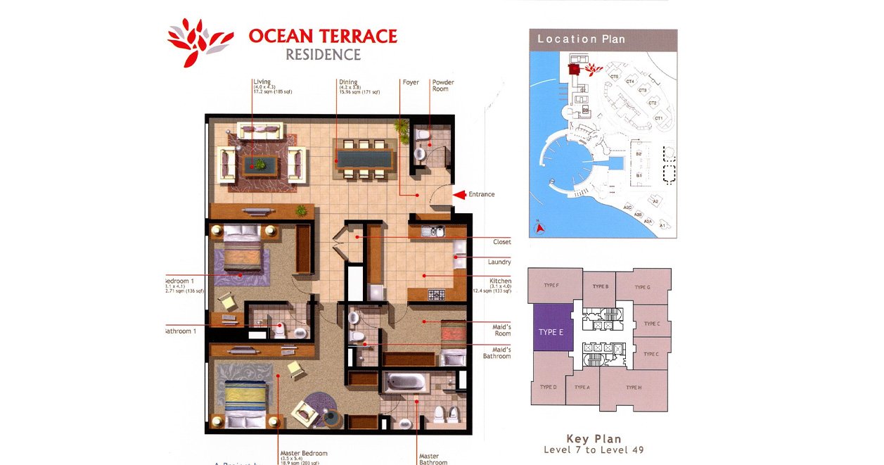 Ocean Terrace Tower offers a limited collection of well-planned apartments ranging from 839 sqft. to 2,730 sqft., catering to singles, families, and investors alike. Each residence is thoughtfully designed with expansive living and dining areas, en-suite bedrooms, built-in wardrobes, and fully equipped kitchens. Select apartments include additional features such as staff rooms, walk-in closets, and pantry spaces, enhancing everyday convenience. The project’s freehold status makes it especially attractive for international buyers seeking secure property investment in Abu Dhabi.