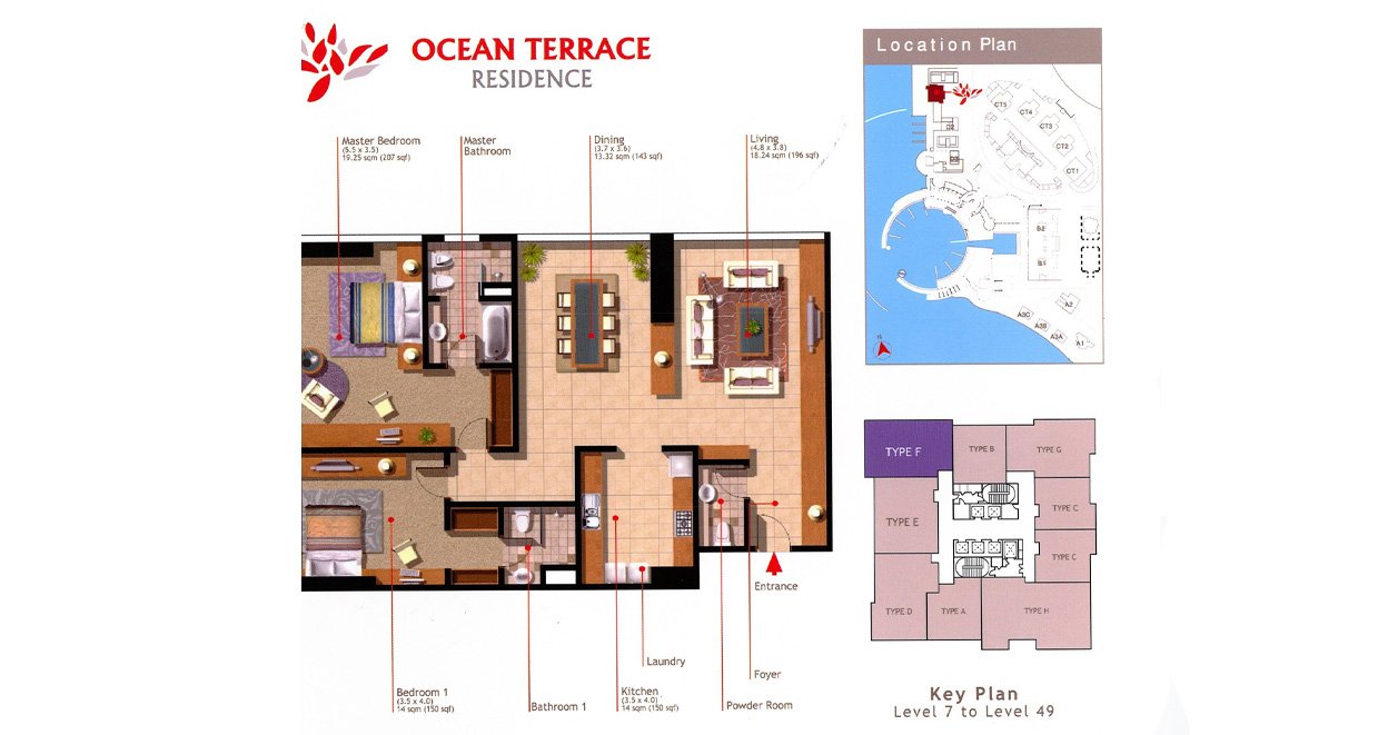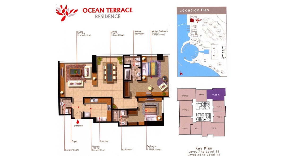 Ocean Terrace Tower offers spacious 1, 2, and 3-bedroom apartments, designed with modern layouts, en-suite bathrooms, and panoramic marina views.